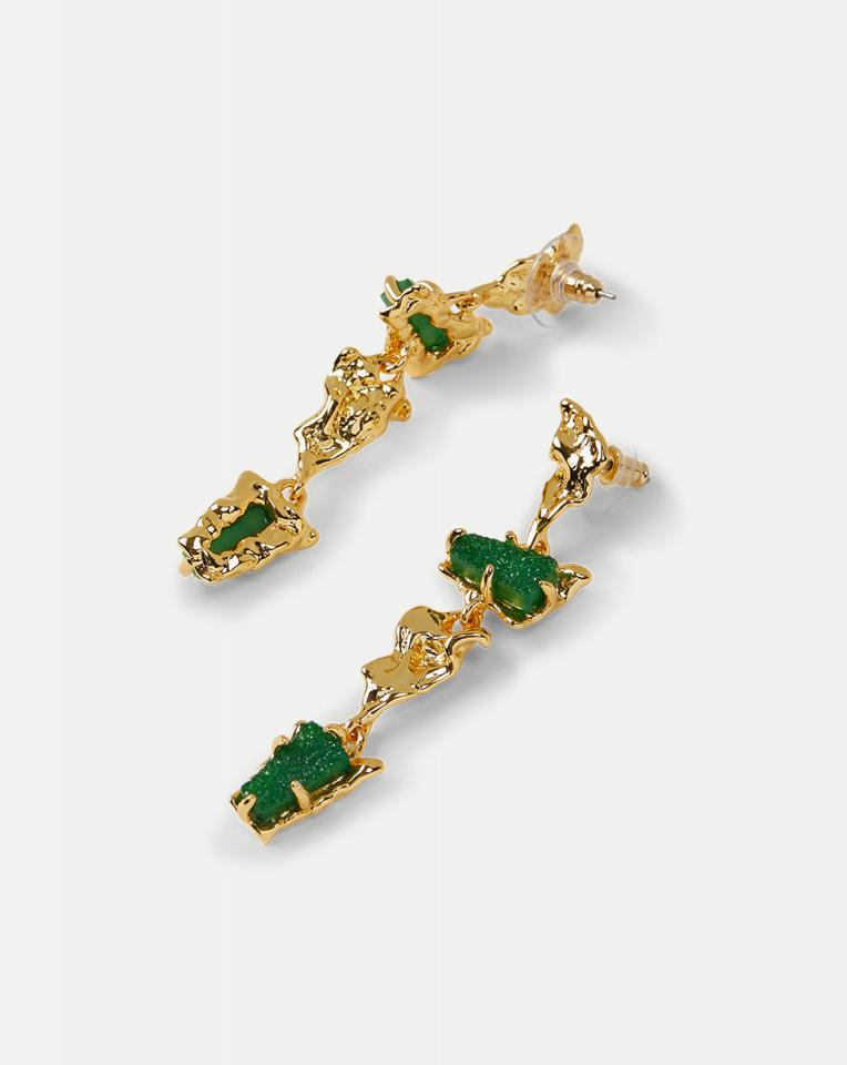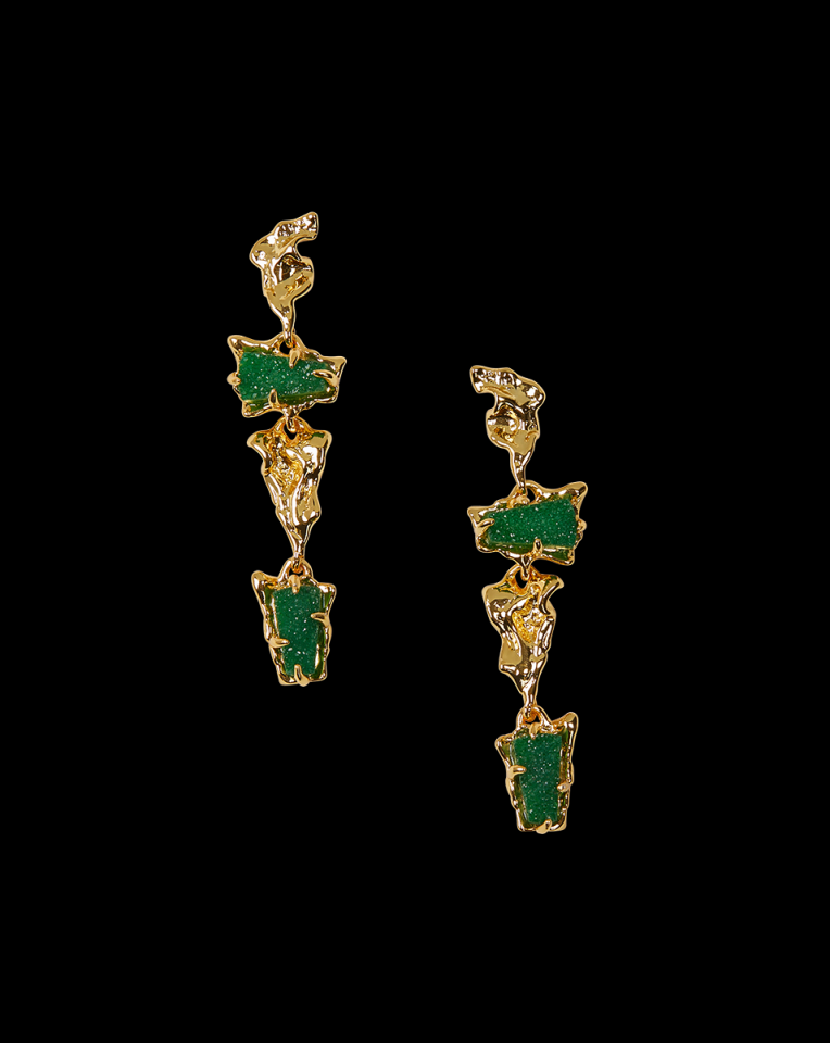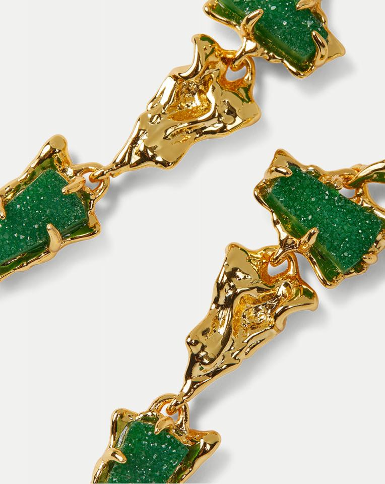 Over its 30-year legacy, the Alexis Bittar brand has become a leading name in the fashion industry, synonymous with fusing art and fashion. By combining craftsmanship with unexpected materials, and a sprinkling of punk aesthetic, Alexis Bittar’s collections have evolved into playful yet sophisticated work. Made in 14kt gold plated brass, the collection’s DNA is further embedded with the consistent use of semi-precious stones, carefully nuanced colours of crystals, and hand-carved and hand painted Lucite.14k gold plated brass Green druzy Length: 2.75″ | Width .75″ To clean, gently wipe the surface with a soft cloth Style #AJE0155-GA1980