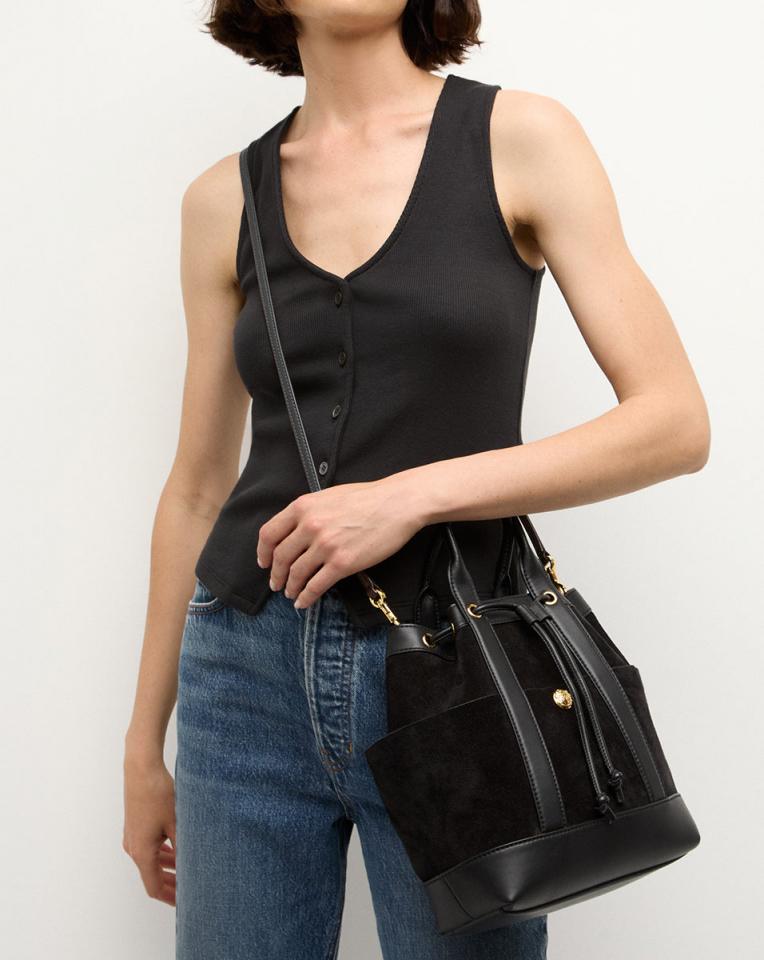 Crafted from soft Italian suede and supple leather, the Goody is perfect for storing your everyday essentials—or goodies. An inner zip pocket as well as outer compartment ensures everything stays organized while the removable shoulder strap allows it to be worn as a crossbody, top-handle, or shoulder bag for maximum versatility.Italian suede with leather detailsLining: Microsuede12.2” L x 4.1” W x 9.8” HHandle drop: 4.3”; strap drop: 21.3”Store in a cool, dry place and wipe any surface dirt with a dry clothStyle #H2408HL106X028