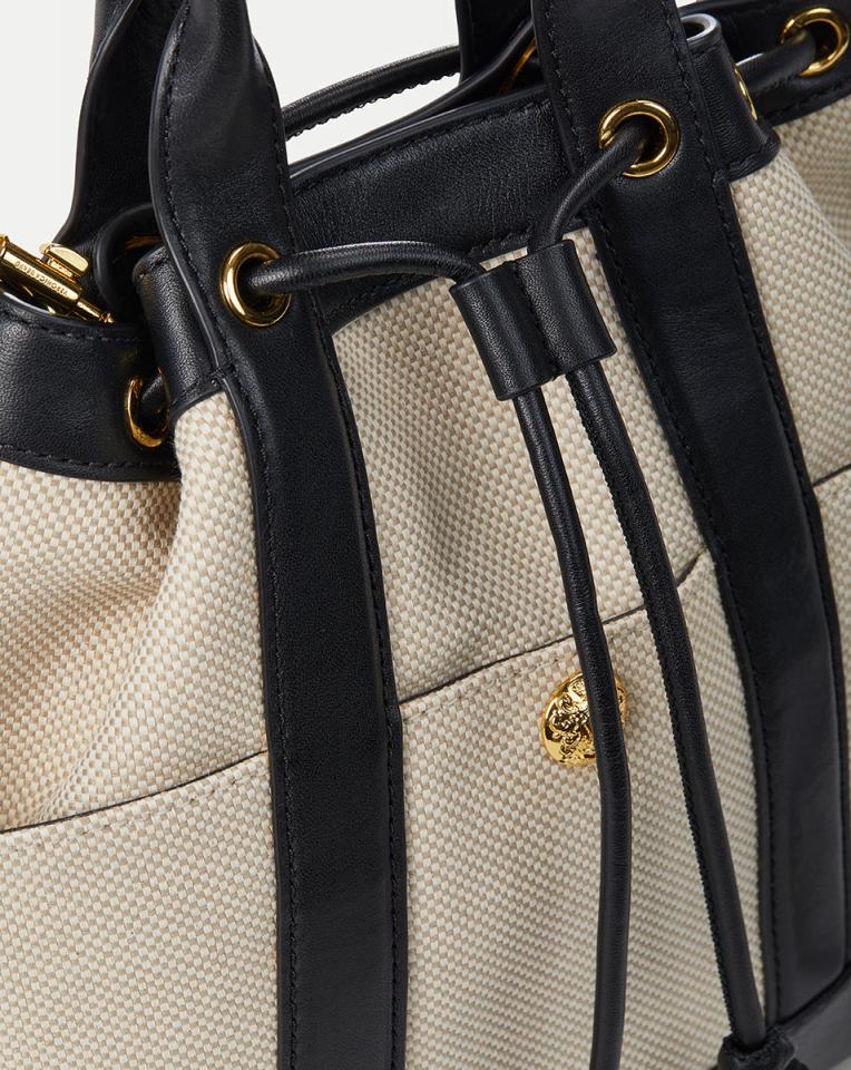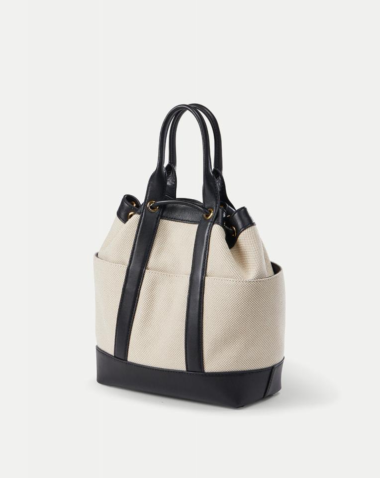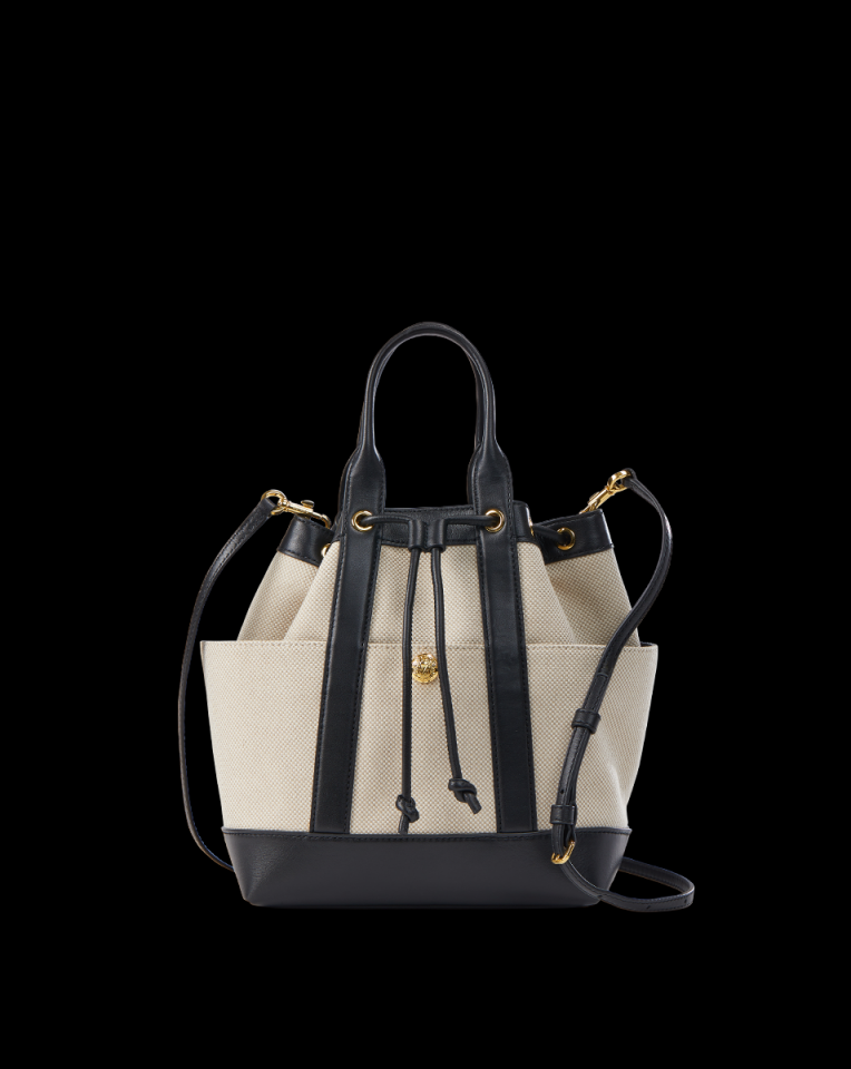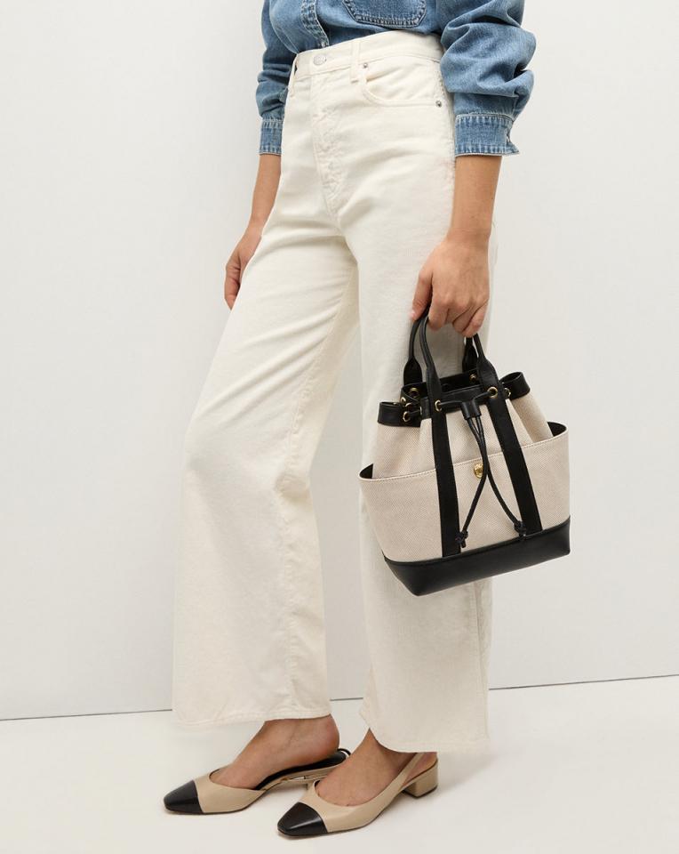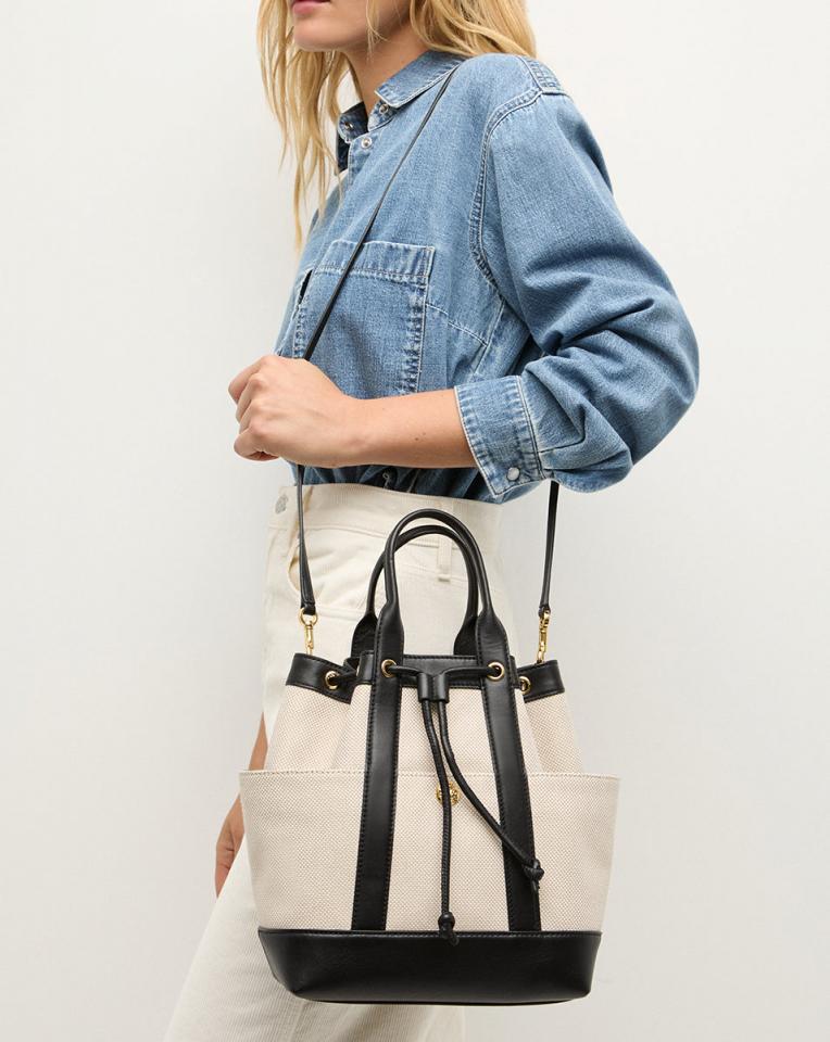 Crafted with durable cotton-blend canvas and supple leather, the Veronica Beard Goody Bag is distinguished by its elevated mixed-media look. Spacious yet compact, its thoughtful silhouette is perfect for storing your everyday essentials—or goodies. An inner zip pocket as well as outer compartment ensures everything stays organized. The ultimate everyday bag, it’s great for travel, running errands or dinner out. And with a removable leather strap, it can be worn as a crossbody, top handle or shoulder bag. A canvas liner, magnetic tab closure and crest-engraved button finish the look.12” L x 4” W x 9.8″ H Cotton canvas with leather trim and cotton canvas liner Store in a cool, dry place and wipe any surface dirt with a dry cloth Style #H2402HCA02X010