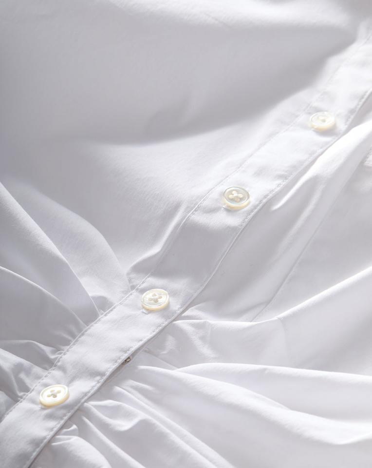 The classic white button-down, with a VB twist. Expertly tailored from premium stretch cotton, the Bosco elevates the wardrobe essential with ruching along the front and sides to flatter the figure. Dropped shoulders, an elongated, curved hem and a chest pocket complete the look. The ultimate in versatility, this cinched white shirt is great for work, weekend and everywhere in between.67% Cotton, 30% Polyamide, 3% ElastaneUnlinedDry clean onlyStyle #2411LSCP40984