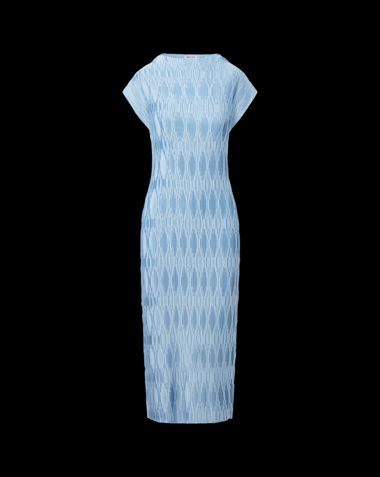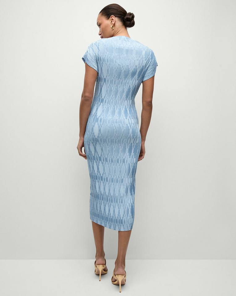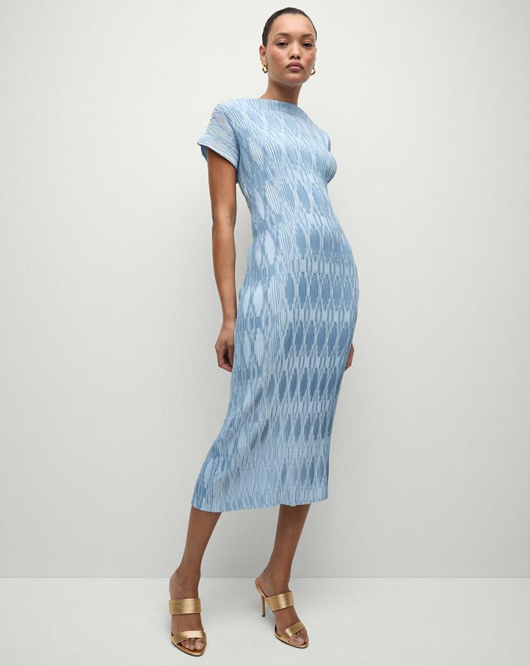 The body-skimming elegance of a fitted dress, with the comfort and ease that only pleats can provide—meet the Gramercy. A master class in construction, the cap-sleeved midi boasts a gently flared funnel neck and allover pleating engineered to create a mosaic pattern. Pair with nude heels to further the elongating effect.100% PolyesterUnlinedDry clean onlyStyle #2412FL5220817