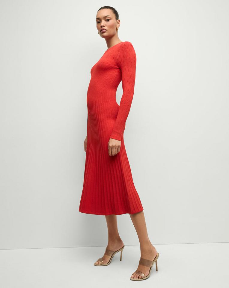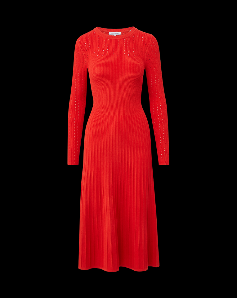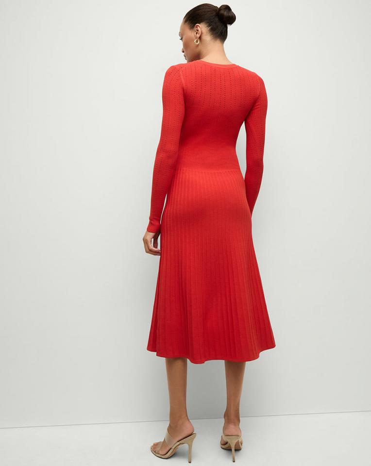 The ease of a sweater dress in a fit-and-flare silhouette. Spun from an exceptionally soft stretch knit, the long-sleeve Nami features a body-hugging bodice and ribbing down the skirt to mimic pleats. Wear alone now and, as the temperature drops, as a foundation piece to layer on jackets and oversized sweaters.83% Viscose, 17% PolyesterDry clean onlyStyle #2411KS1290219